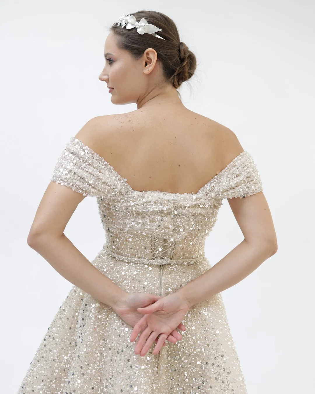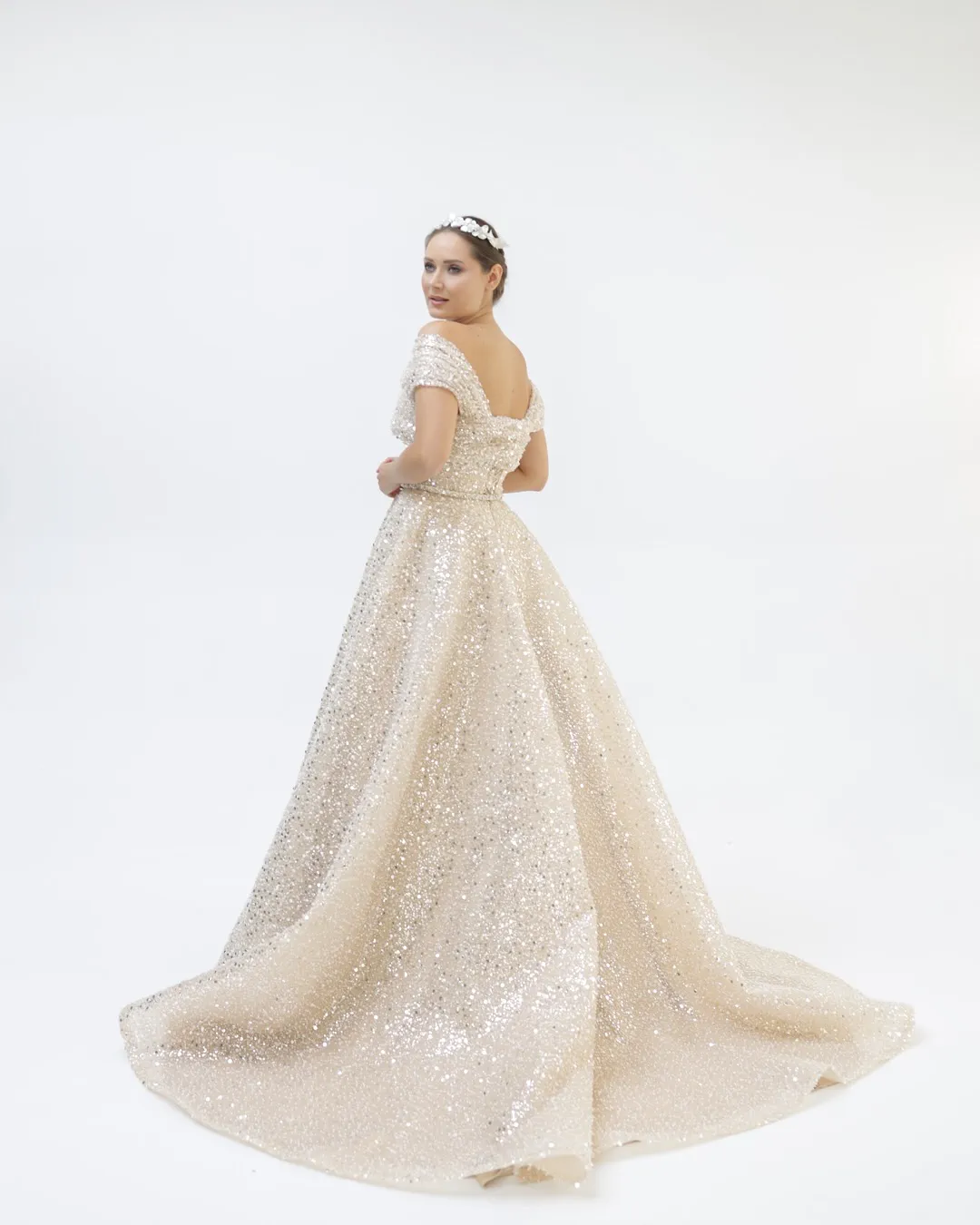 Bu model, belden oturan üst kısmı ve hacimli tül eteğiyle klasik prenses kesimini modern dokunuşlarla buluşturuyor. İnce işlemeleri ve ışıltılı detayları sayesinde perde arkasındaki her anı özel hissettiriyor. Omuz kol detaylarından etek uçlarına kadar her adımda zarafet yayıyor. Nişan töreninizde hem fotoğraflarda hem anlarda kendinizi özel hissetmek istiyorsanız, bu elbise stilinizin ve romantizmin mükemmel ifadesi olacak.