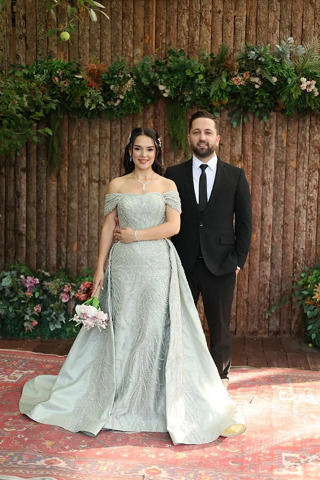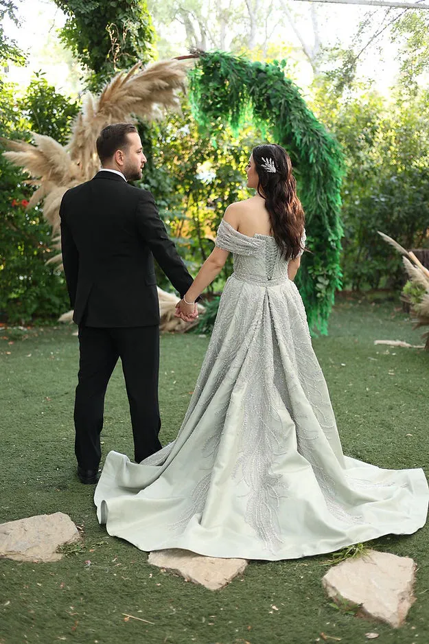 501 Model Su Yeşili Nişanlık, doğadan ilham alan zarif tonuyla göz kamaştırır. Omuzdan açık (off-shoulder) kesimi ve korseli formu, zarafeti feminen bir siluetle buluşturur. Gövde kısmındaki ışıltılı taş işlemeler ve desenli kumaş yapısı, elbiseye sofistike bir parlaklık kazandırır.