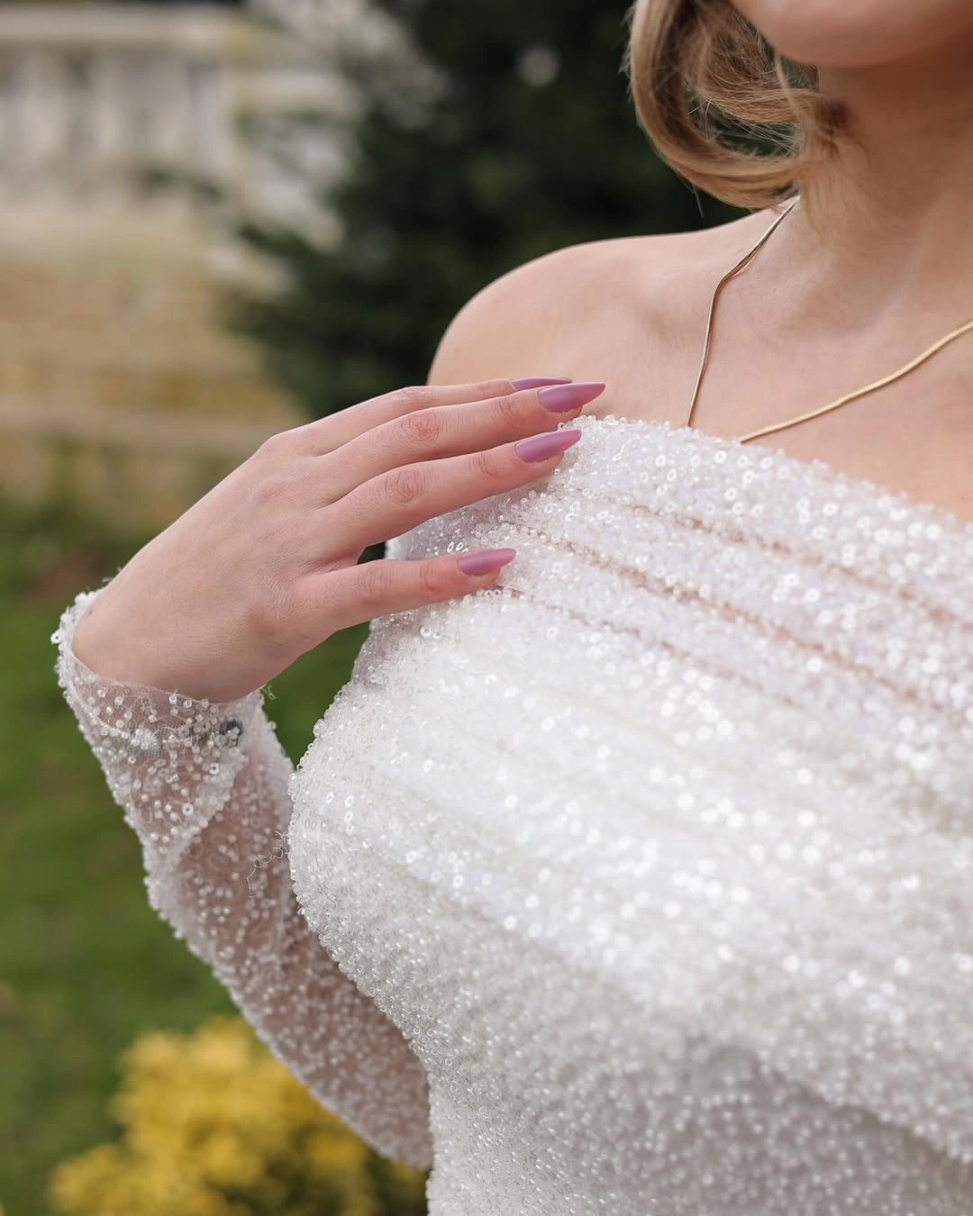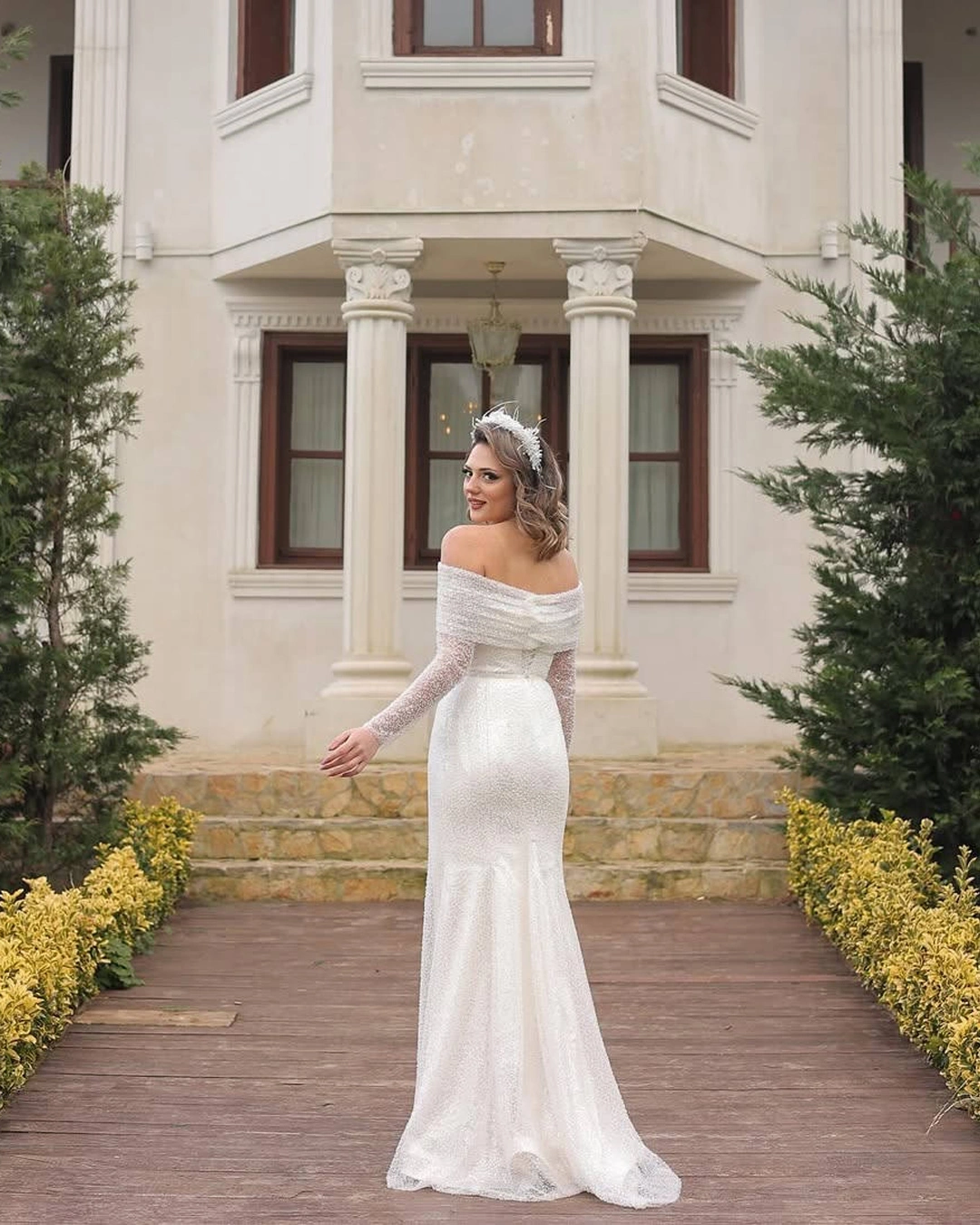 Omuzdan zarifçe dökülen drapeler, vücuda oturan balık formu ve ışıltılı payet dokusuyla asil bir duruş sergiler.
