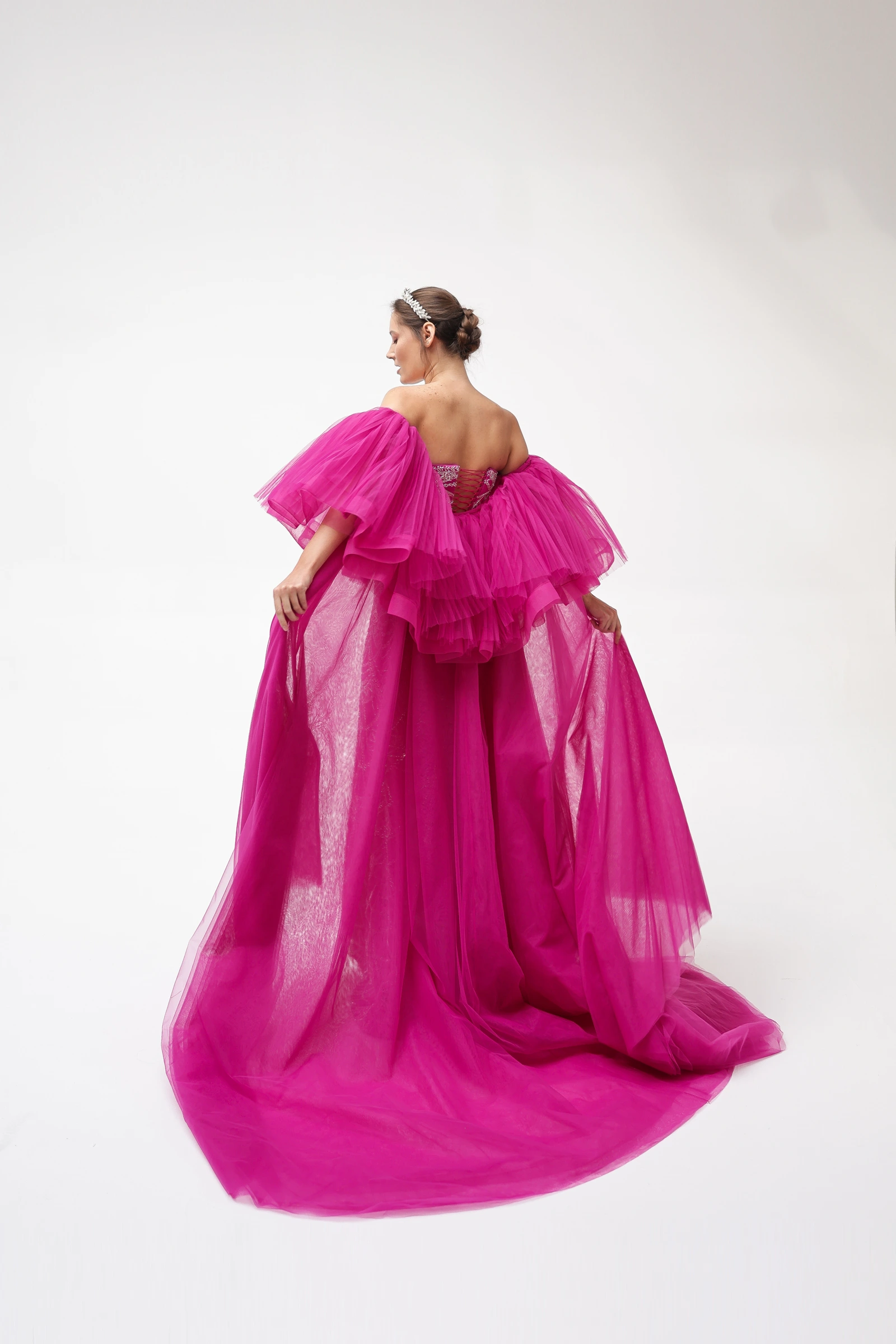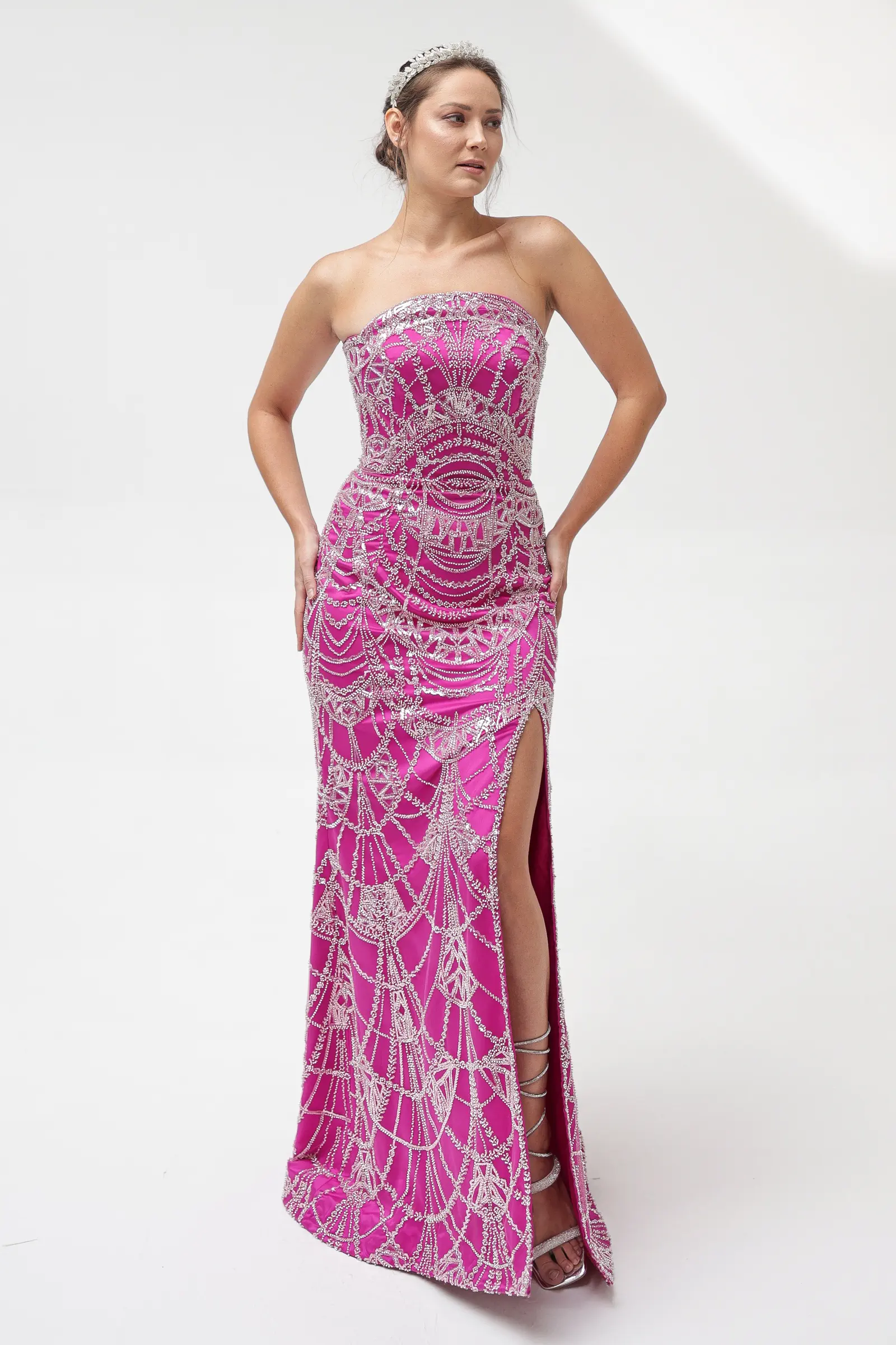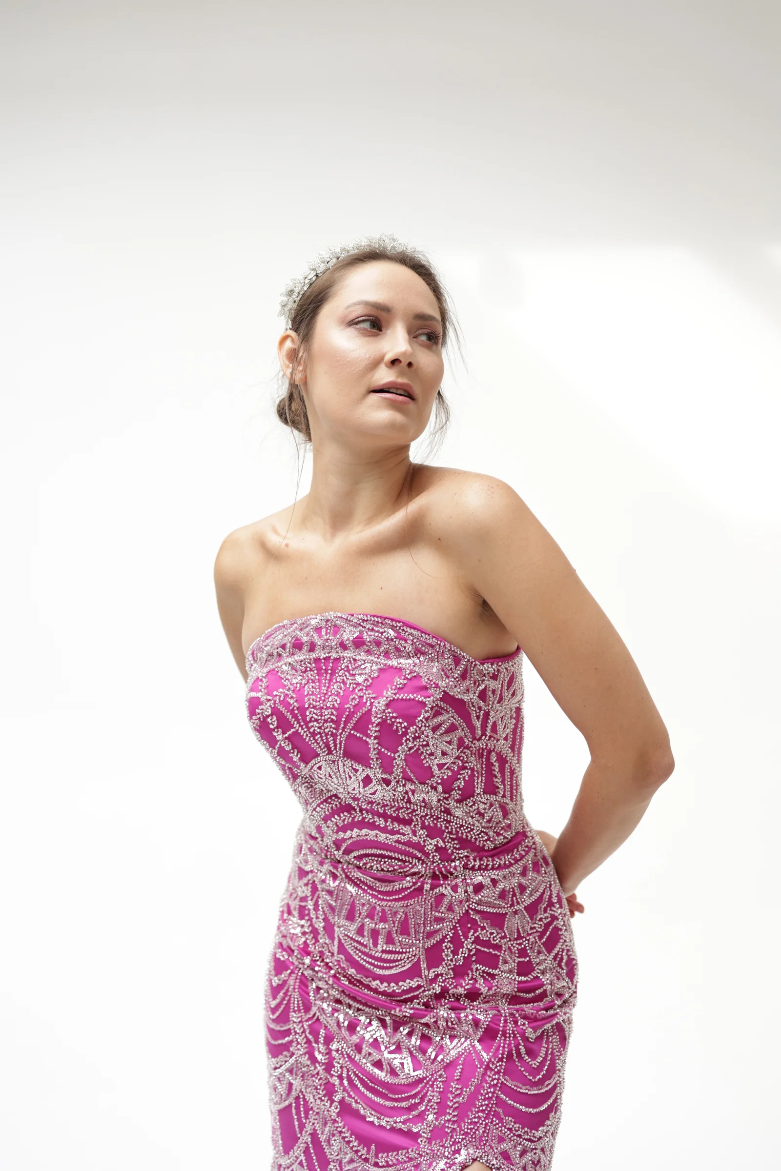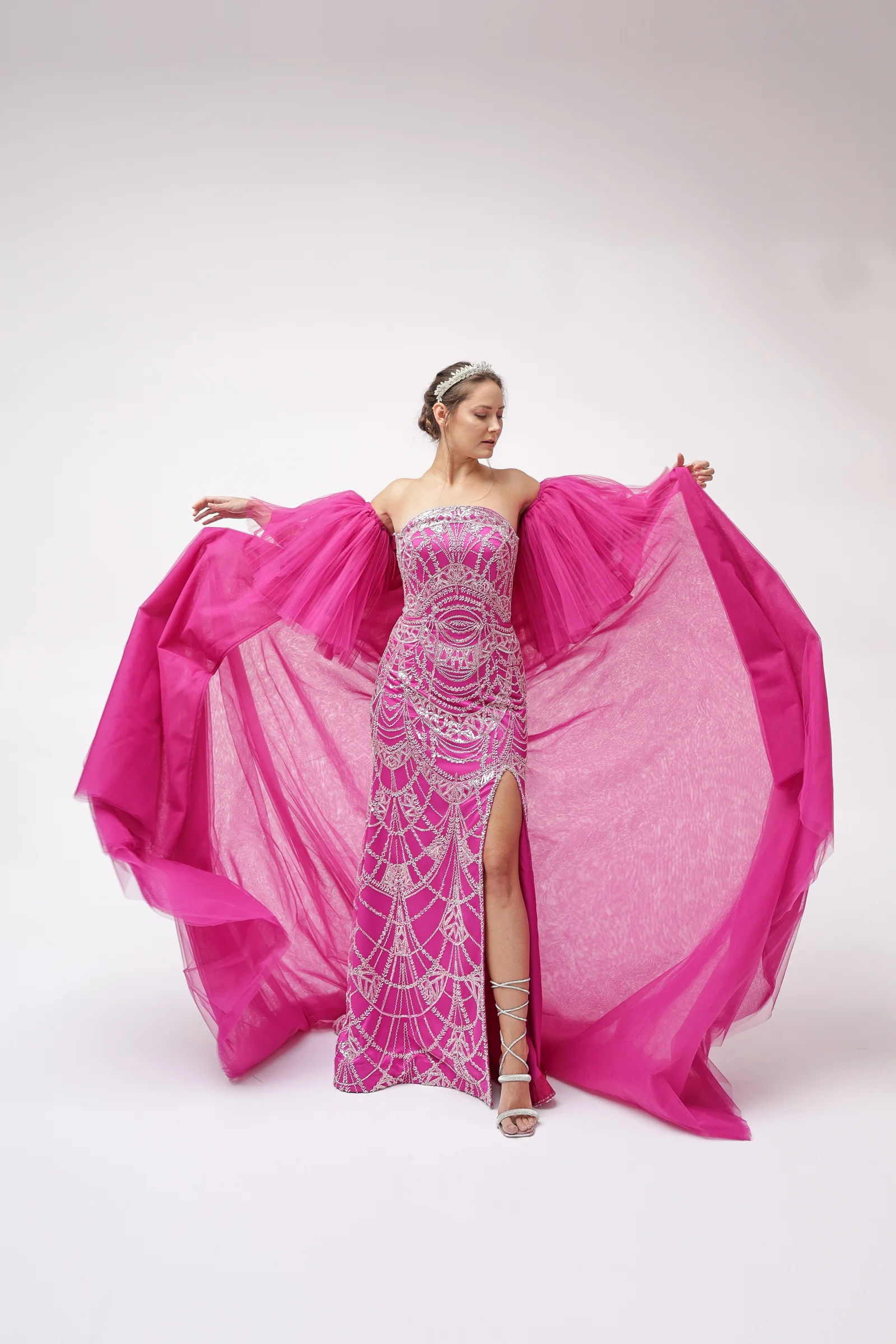 Rüya gibi fuşya tonuyla göz alıcı bir ışıltı sunan bu özel tasarım, zarafetiyle 2025 sezonunun favorisi olmaya aday.