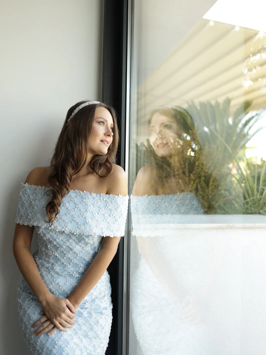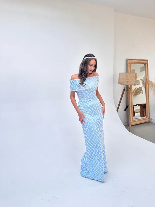 El işçiliğiyle yerleştirilen inci ve boncuk detayları, elbiseye ışıltılı bir doku kazandırırken, off-shoulder (omuz açık) kesimi feminen bir duruş sunar.